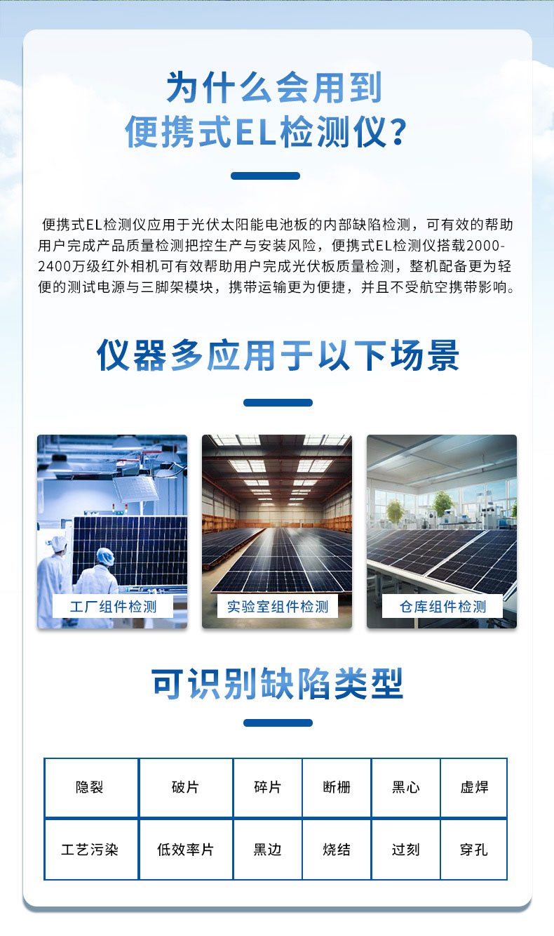 【产品简介】组件el测试仪产品简介:组件el测试仪应用于光伏太阳能电池板的内部缺陷检测,可更好的帮助用户完成产品质量检测把控生产与安装风险。组件el测试仪搭载2416万级红外相机可有效帮助用户···