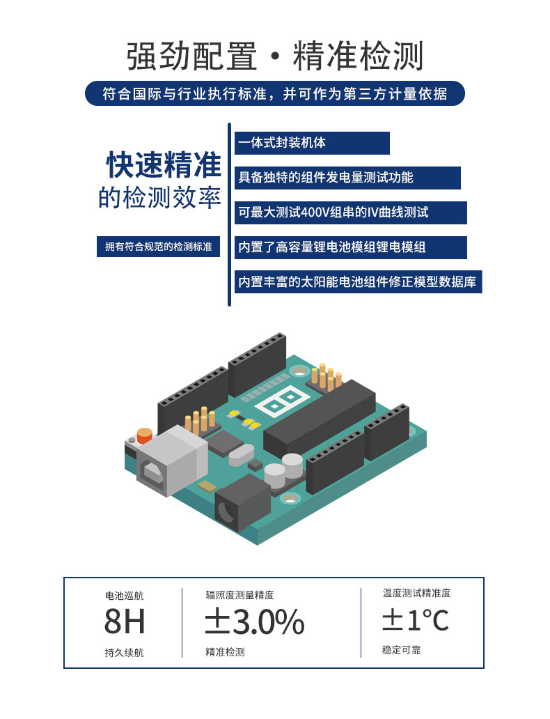【产品简介】一、手持式iv测试仪产品简介手持式iv测试仪,电压测试可达到400V,电流测试可达20A,能够测试1000W的光伏组件。可以测试太阳能电池组件/方阵的开路电压、短路电流、最大功率等···