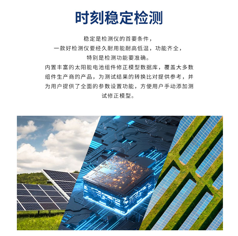 内置丰富的太阳能电池组件修正模型数据库,覆盖大多数组件生产商的产品,为测试结果的转化比提供参考并为用户提供了全面的参数设置功能可手动添加。