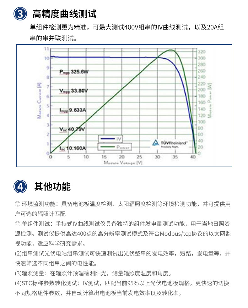 (1)单组件测试:手持式IV曲线测试仪具备独特的组件发电量测试功能,用于当地⽇照资源检测。测试仪提供高达400点的高分辨率测试模式及符合Modbus/tcp协议的以太网监视功能,适应科学研究需求。