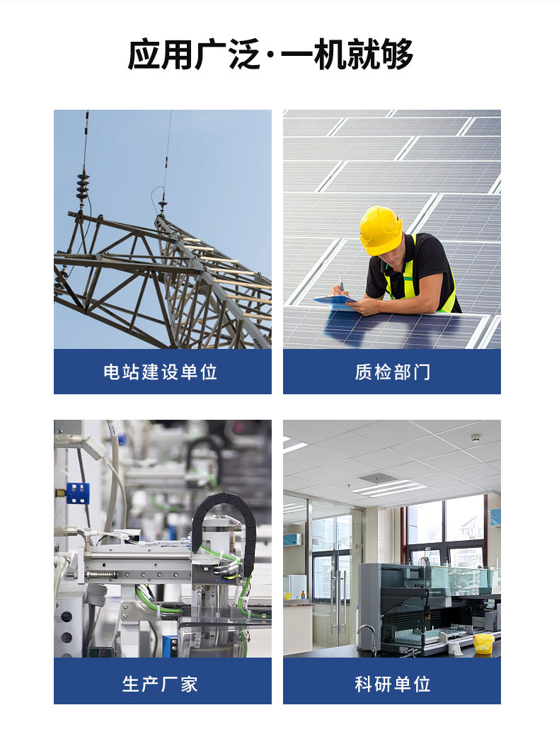 (4)STC标称参数转化测试:IV测试,匹配当前95%以上光伏电池板规格,更快速的切换不同规格组件参数,并⾃动计算出电池板当前发电效率以及转化率。