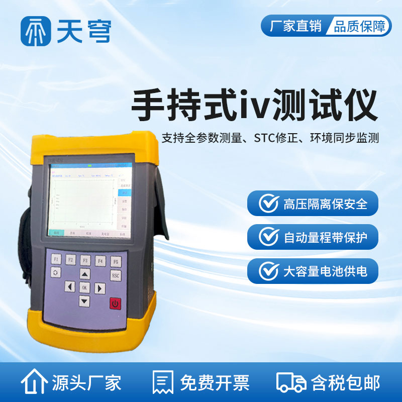 手持式iv测试仪,电压测试可达到400V,电流测试可达20A,能够测试1000W的光伏组件。可以测试太阳能电池组件/方阵的开路电压、短路电流、最大功率等参数,为用户提供精准、高效的伏安特性测试工具。能够快速检测光伏组串在自然光照下的⼯作特征,设备操作简单,携带方便,且配备高精度辐照计与温度传感器,可提供准确的现场辐照数值等参数。