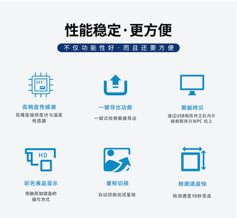 (4)STC标称参数转化测试:IV测试,匹配当前95%以上光伏电池板规格,更快速的切换不同规格组件参数,并⾃动计算出电池板当前发电效率以及转化率。
