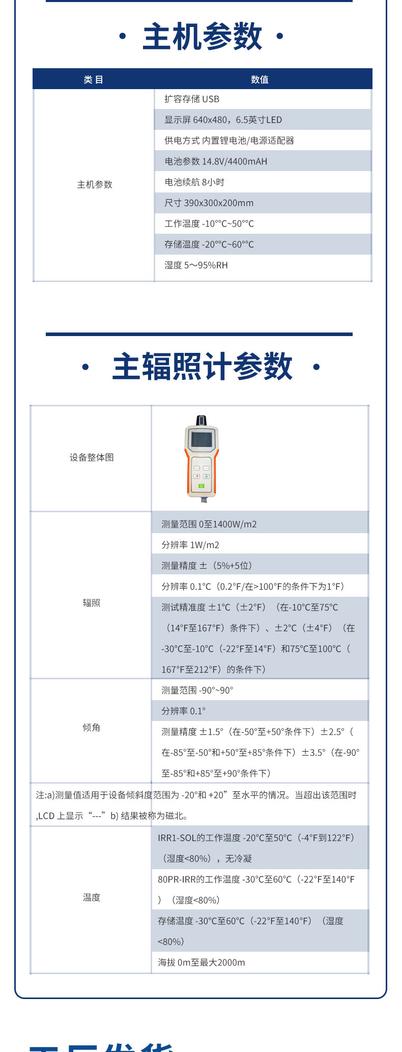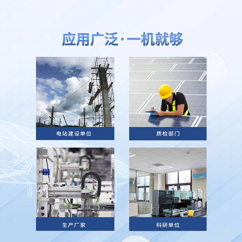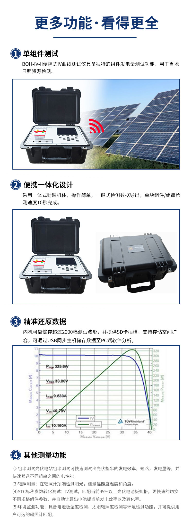 产品为便携式iv测试仪,电压测试可达到1500V,电流测试可达20A,能够测试30kW的光伏组件。可以测试太阳能电池组件/方阵的开路电压、短路电流、最大功率等参数,为用户提供精准、高效的伏安特性测试工具。能够快速检测光伏组串在自然光照下的⼯作特征,设备操作简单,携带方便,且配备高精度辐照计与温度传感器,可提供准确的现场辐照数值等参数。