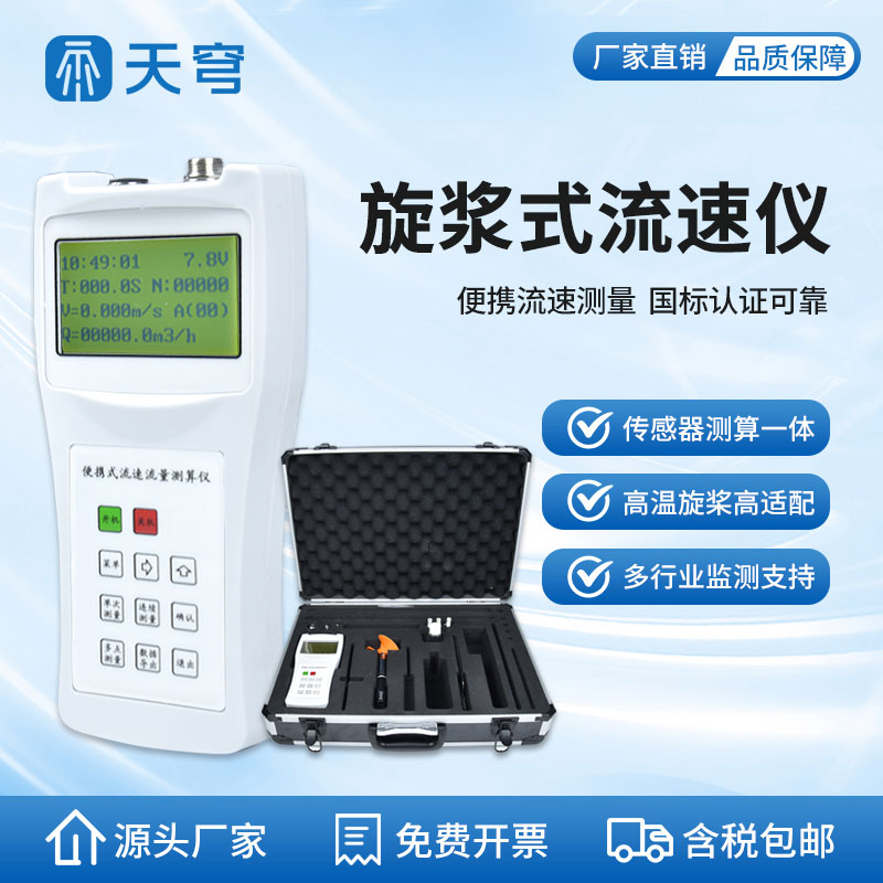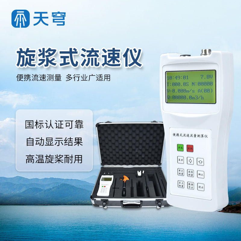 便携式流速仪主要由旋桨式流速传感器、流速测算仪、测杆组成。全套仪器置于高级铝合金密码箱内。接通信号线,即可进行各明渠中流速的测量,并自动显示流速。