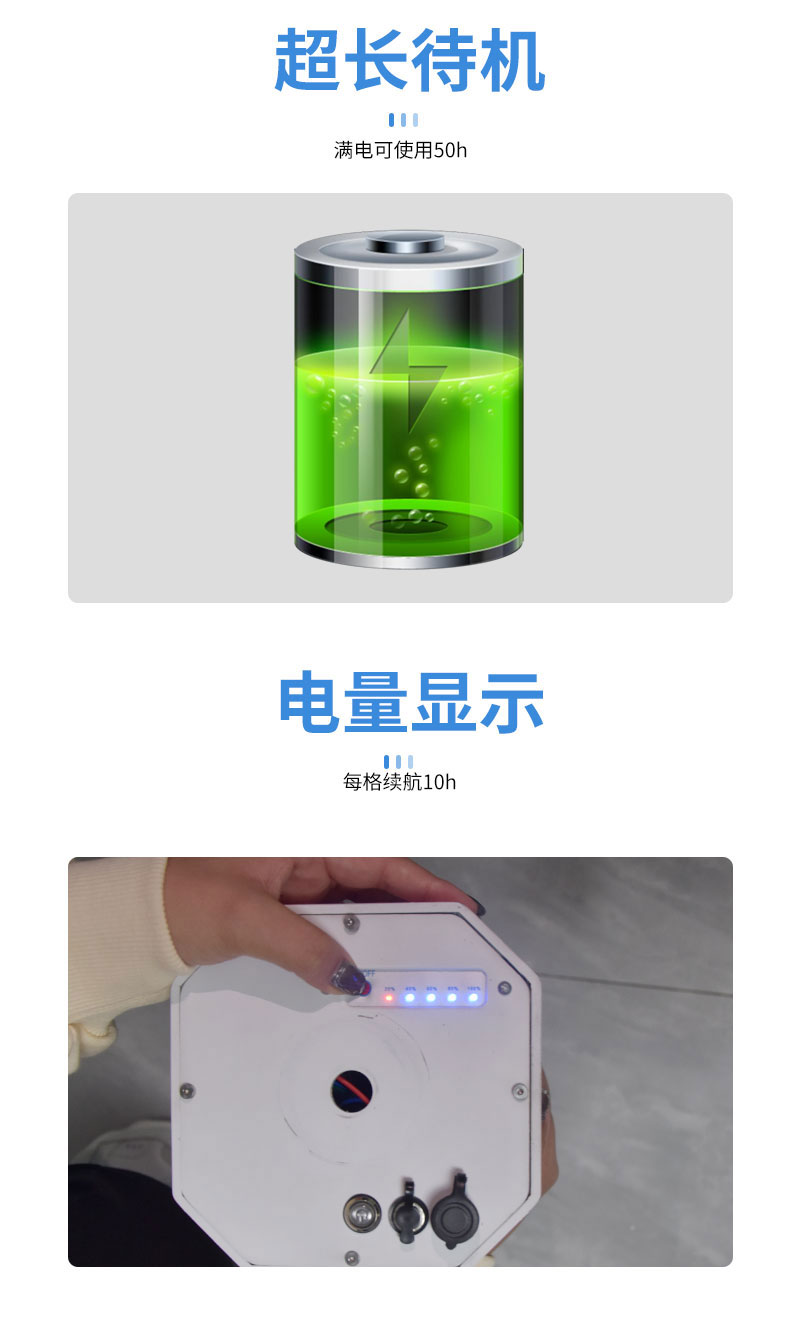 10.锂电池:容量12000maH,电池续航时间≥50h,带电量显示功能