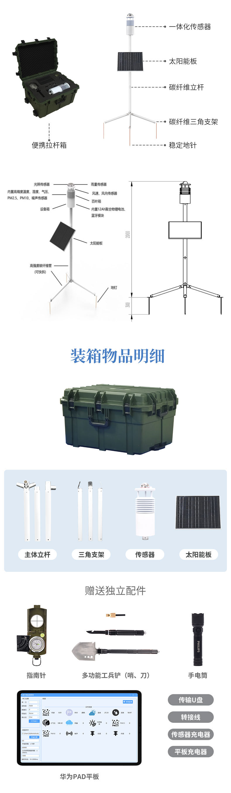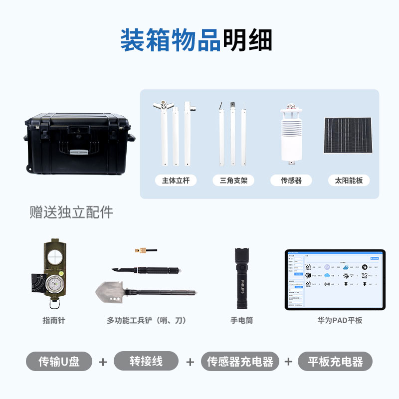 我公司针对客户野外使用情况,创新性的将便携式气象站、指南针、华为pad、工兵铲集成到一个拉杆箱中,体积小、重量轻、方便移动观测气象数据。