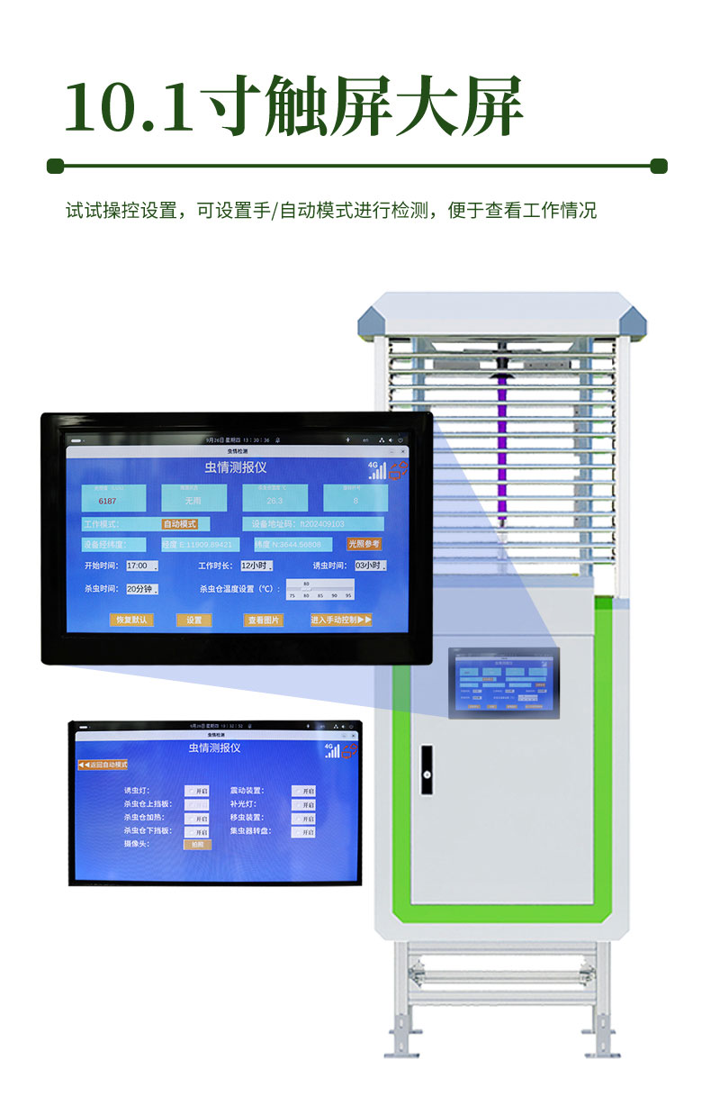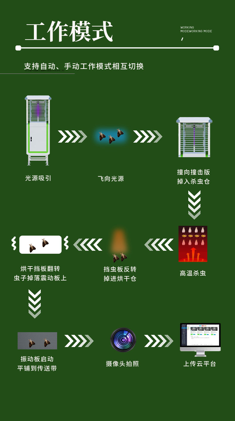 工作原理:利用光、电、数控技术实现诱虫、杀虫、分装等功能。在无人监管的情况下,可自动完成诱虫,杀虫,虫体分散,拍照,运输,收集,排水等系统作业,然后利用无线传输技术、物联网技术并实时将环境气象和虫害情况上传到指定农业云平台。