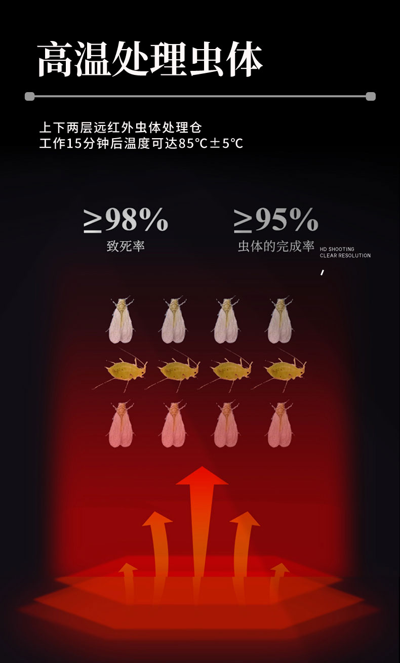 8.红外杀虫,远红外虫体处理仓温度控制:工作15分钟后温度到达90±5℃,处理时间任意可调。