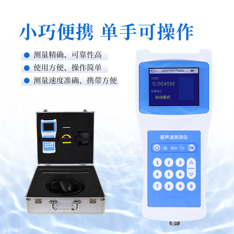 超声波测深仪是测量水库、湖泊、江河、浅海等水体的便携式测深仪,测深时将超声波换能器置于水面或一定位置,利用超声波在水中的固定声速VC和超声波发射到接收的时间T,仪器自动换算出水深H。本品是我司积多年生产经验,吸取了多种同类产品优点,而开发的一款方便适用的手持式超声波测距仪表。超声波收发转换电路采用专用大规模集成电路,元件贴片率99%,并以液晶显示测深结果,保证了产品的长期可靠性,同时将其功耗降到了极低。具有测量精确、耗电省、可靠性高、使用方便、操作简单、测量速度准确、携带方便等优点。仪器可在静水中测深,也可在具有一定速度的水中测深;水流速度可达5m/秒左右,是水文测验、水电厂库区、湖泊、河道勘测和环境水域监测的理想水深测量仪器。
