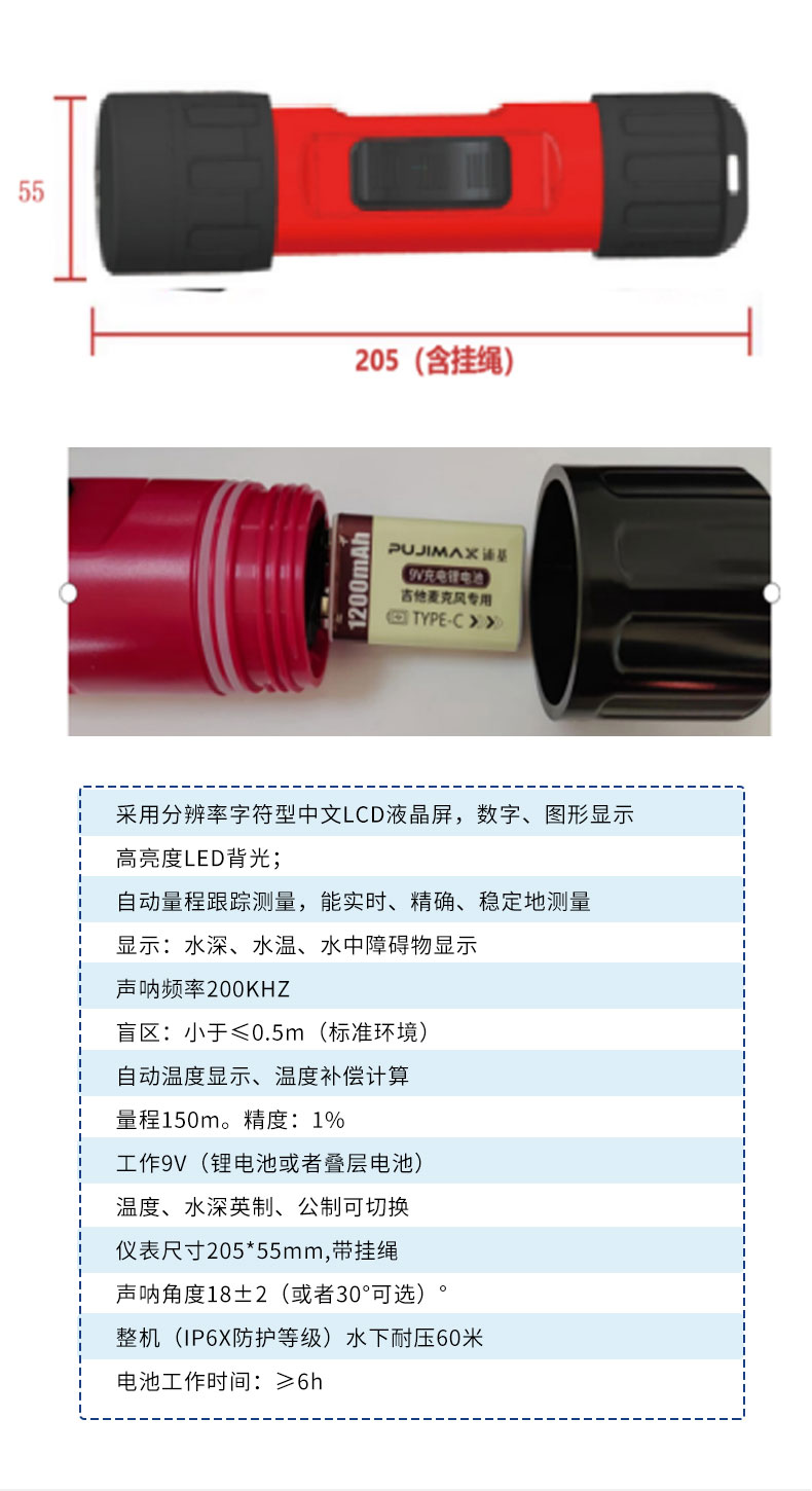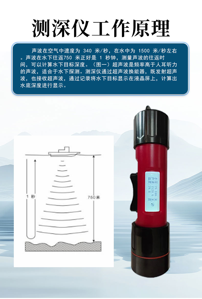 【产品简介】一、一体式水深水温仪工作原理声波在空气中速度为340米/秒,在水中为1500米/秒左右。声波在水下往返750米正好是1秒钟,测量声波的往返时间,可以计算水下目标深度。超声波是频率高···
