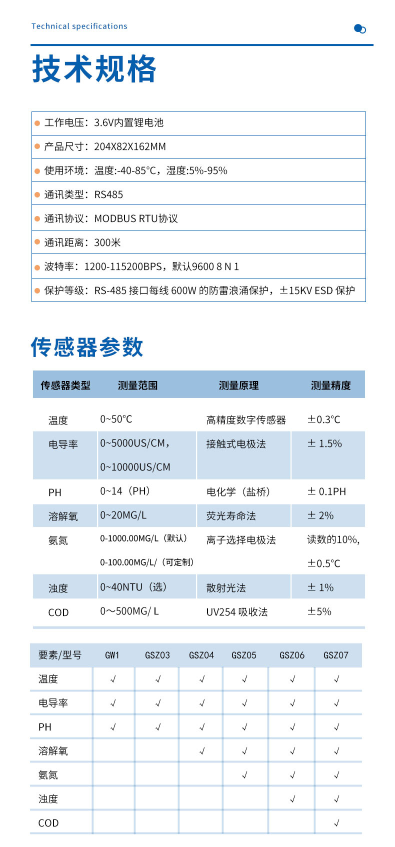 三、城市管网水质监测系统规格参数