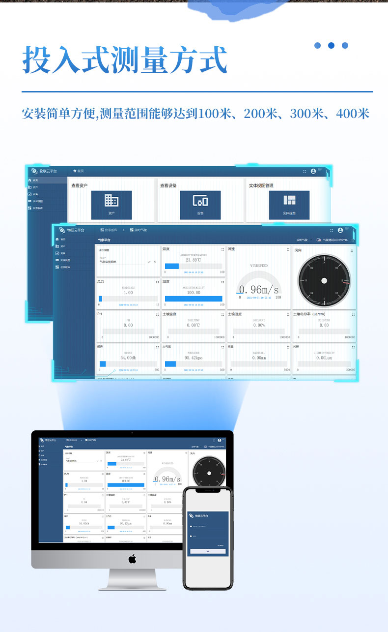 投入式水位监测设备根据压力与水深成正比的静水压力原理,运用水压敏感集成元器件做深井水位测量仪传感器探头,当传感器探头固定在水下某一测点时,该测点以上水柱压力高度加上该点的高程,即可间接测量出水位高低(水面到井口的距离);直接测量出的是传感器探头以上深井的液位实际高度。