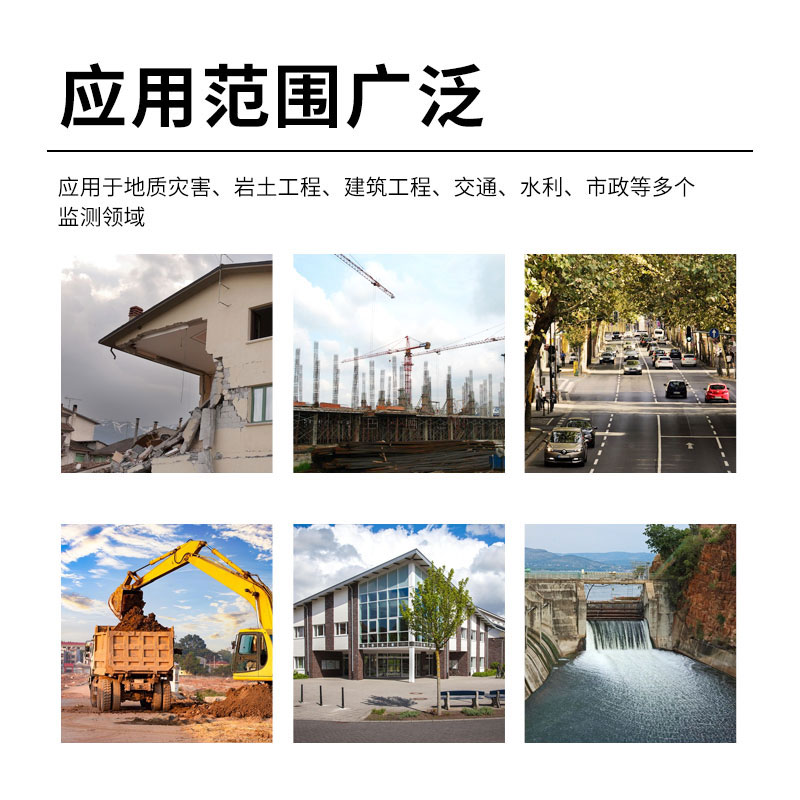 本产品广泛应用于地质灾害、岩土工程、建筑工程、交通、水利、市政等多个监测领域,特别适用于地表裂缝、卸荷裂隙、房屋或结构裂缝等相对位移的精确监测。