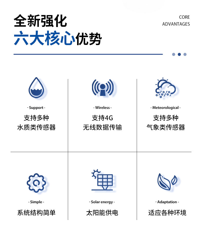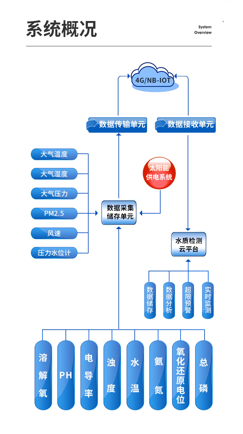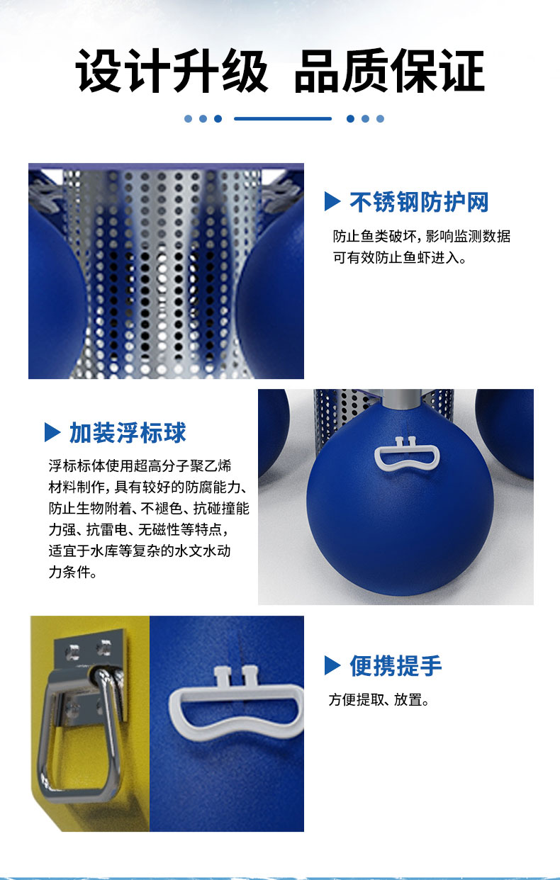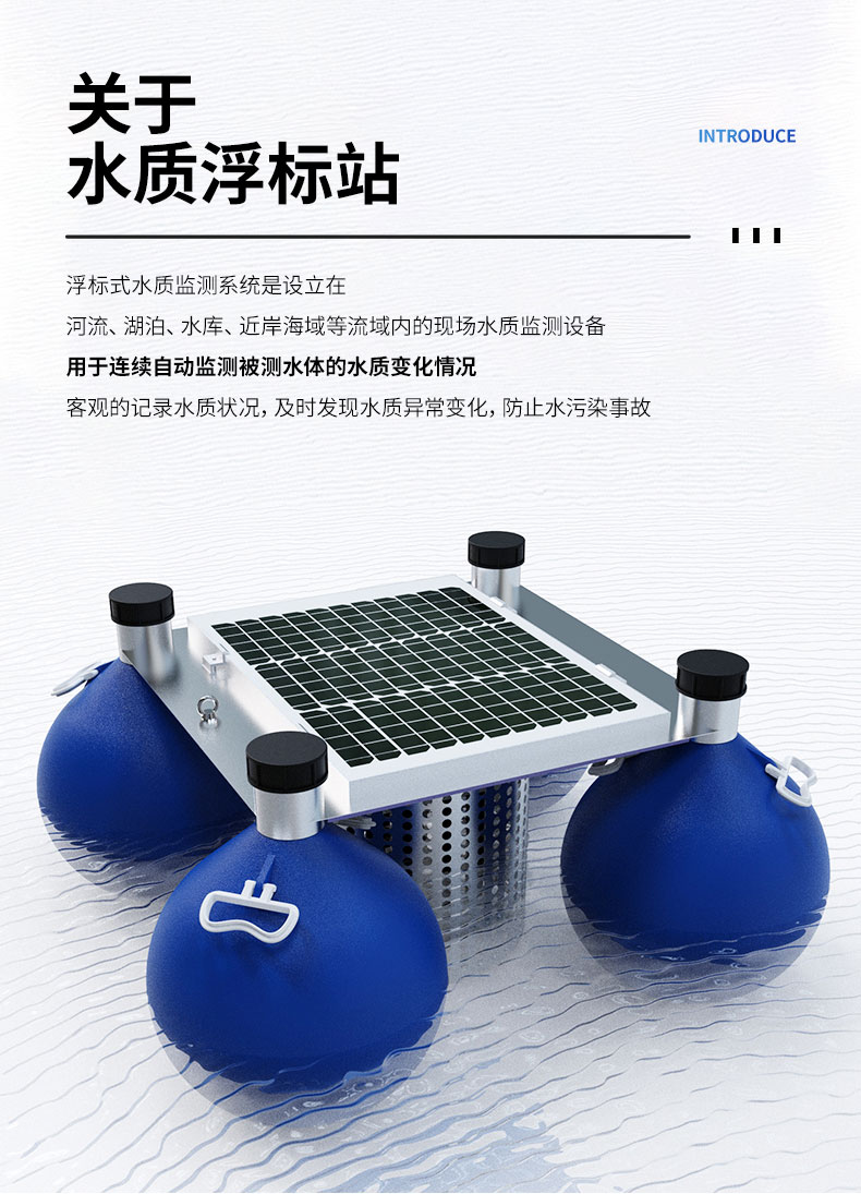 可对湖泊或流域内的水文、水质和气象参数进行实时测量。系统集数据采集、传输于一体,并具有超标短信报警功能、自动光感功能。具有测量参数多,测量精度高,存储容量大,方便组网,运行稳定等特点。浮标采用无人值守的智能控制系统,完成对多个传感器的数据采集以及数据的发送;太阳能电池板和大容量蓄电池组成太阳能供电系统,可保证系统在野外长期工作所需用电;浮标标体使用超高分子聚乙烯材料制作,具有较好的防腐能力、防止生物附着、不褪色、抗碰撞能力强、抗雷电、无磁性等特点,适宜于水库等复杂的水文水动力条件。