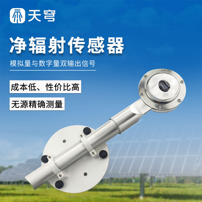太阳净辐射传感器被用来测量由天空向下投射的和地球表面向上投射的全波段辐射量的净差值。测量范围为0.3~3微米的短波辐射和3~100微米的地球辐射。应用于土壤水分蒸发蒸腾计算、及热平衡相关的建筑机理研究。