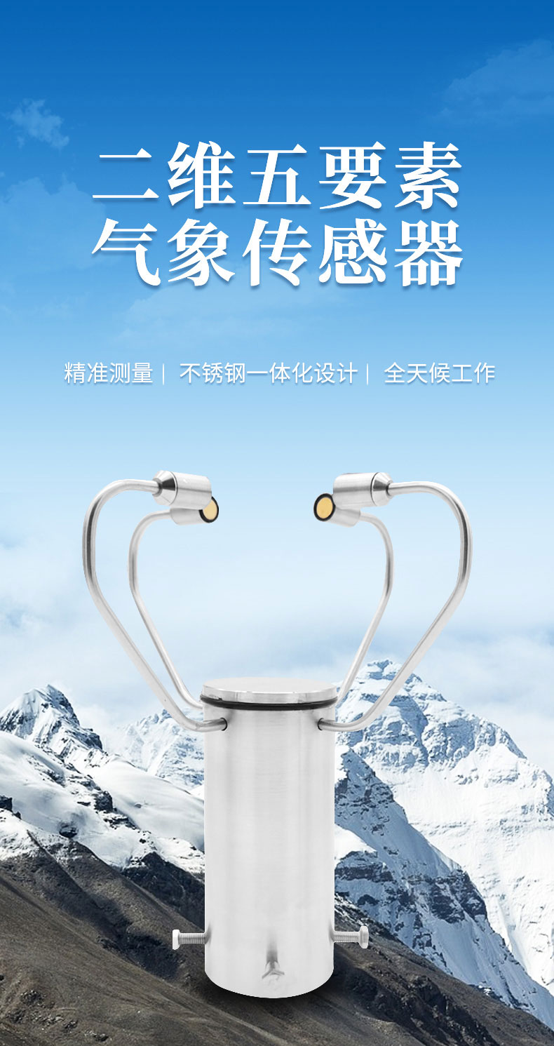【产品简介】一、二维五要素气象传感器产品简介二维五要素气象传感器是一款全天候户外一体环境监测设备,可以直接实时的检测环境温度,相对湿度,大气压力,风速、风向等气象环境要素,测量精度高,性能可靠···