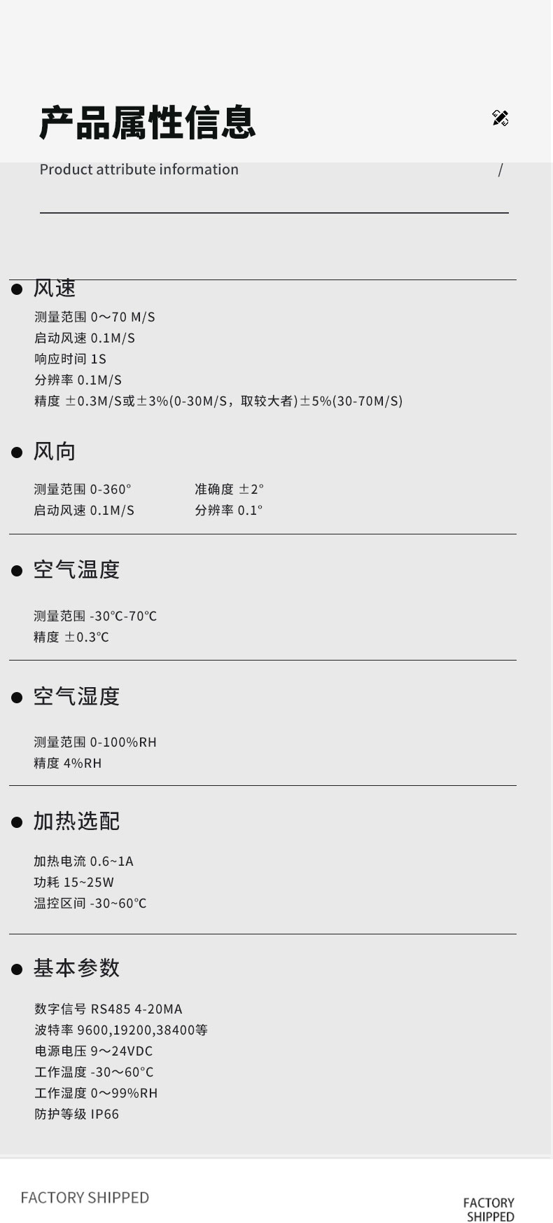 1.不锈钢一体化外观设计,外观精美,采用自主研发的传感技术实时测量,无启动风速限制,无角度限制,同时获取风速、风向的数据。