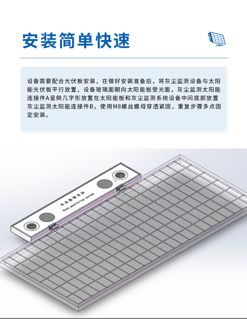 该设备需要配合光伏板安装,在做好安装准备后,将灰尘监测设备与太阳能光伏板平行放置,设备玻璃面朝向太阳能板受光面,灰尘监测太阳能连接件A呈倒几字形放置在太阳能板和灰尘监测系统设备中间底部放置灰尘监测太阳能连接件B,使用M8螺丝螺母穿透紧固,重复步骤多点固定安装。