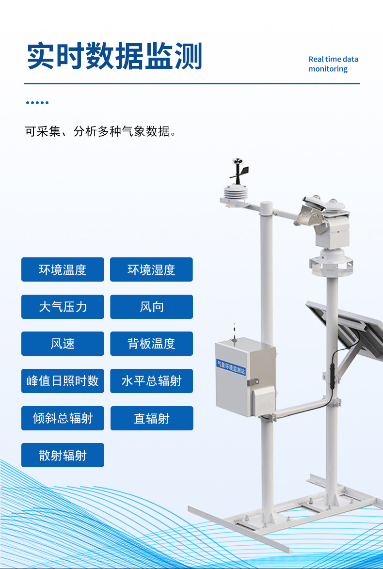 1、实时数据监测:可采集、分析多种气象数据,包括有并网运行上报数据环境温度、环境湿度、大气压力、风速、风向、背板温度、峰值日照时数、水平总辐射、倾斜总辐射、直辐射、散射辐射等多种气象数据。