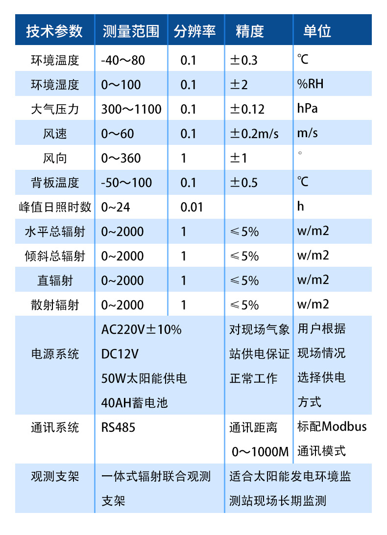 | 观测支架 | 一体式辐射联合观测支架 | 适合太阳能发电环境监测站现场长期监测 | ||