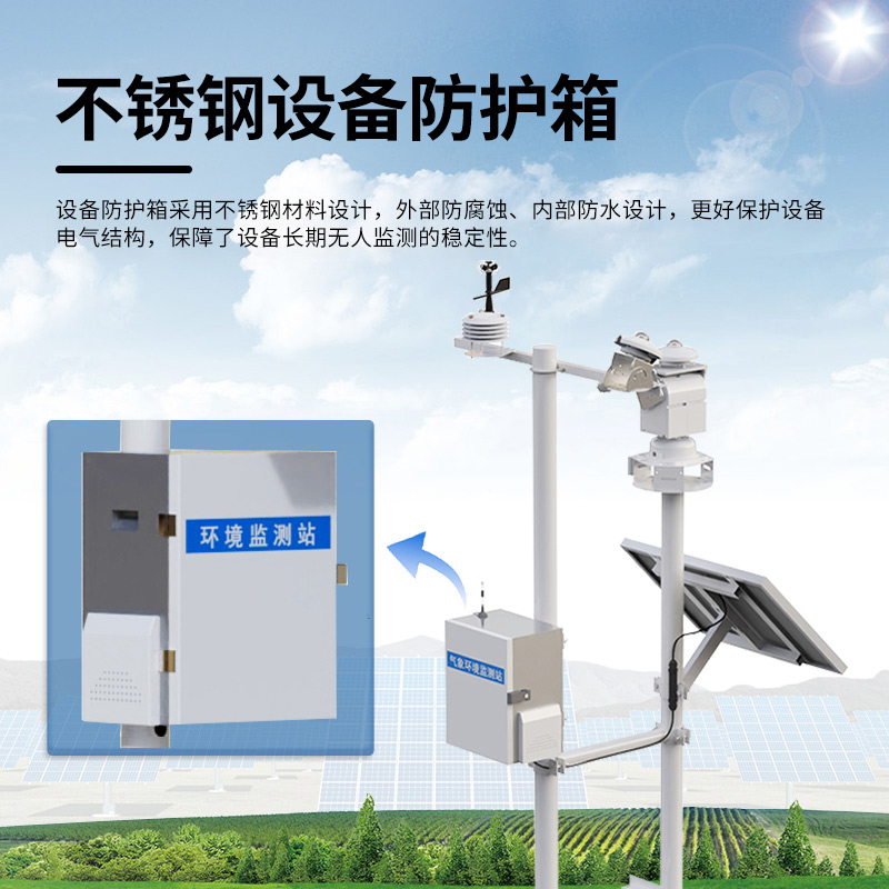 5、不锈钢设备防护箱:设备防护箱采用不锈钢材料设计,外部防腐蚀、内部防水设计,更好保护设备电气结构,保障了设备长期无人监测的稳定性。