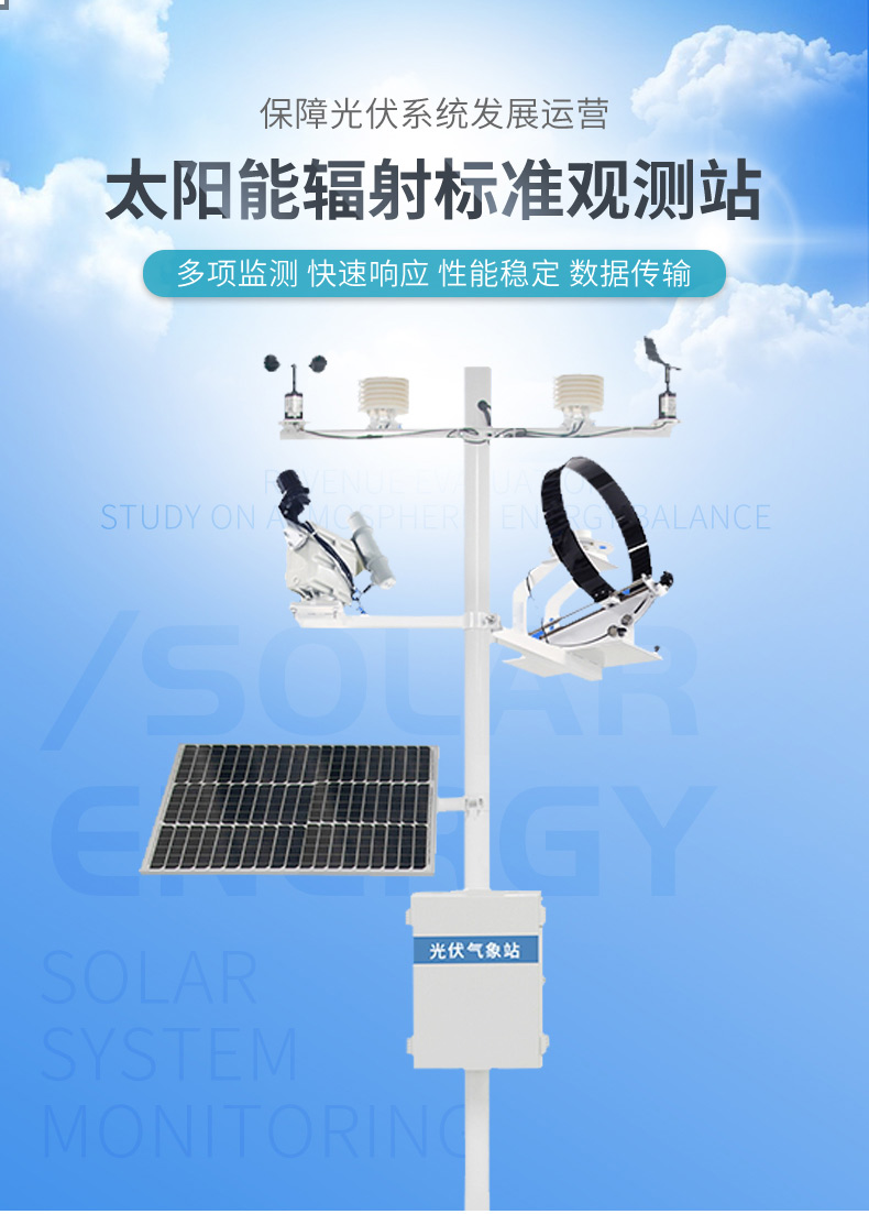 【产品简介】一、太阳辐射观测站产品概述太阳辐射观测站可对太阳的总辐射、散射辐射、直接辐射、反射辐射、净辐射、紫外辐射、光谱辐射、分光谱辐射及光合有效辐射等各种类型的太阳辐射能量数据进行测量,并···