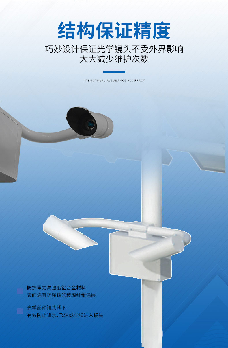 3.风速风向传感器:探头顶盖隐藏,避免雨雪堆积的干扰,避免自然风遮挡。原理为发射连续变频超声波信号,通过测量相对相位来检测风速风向