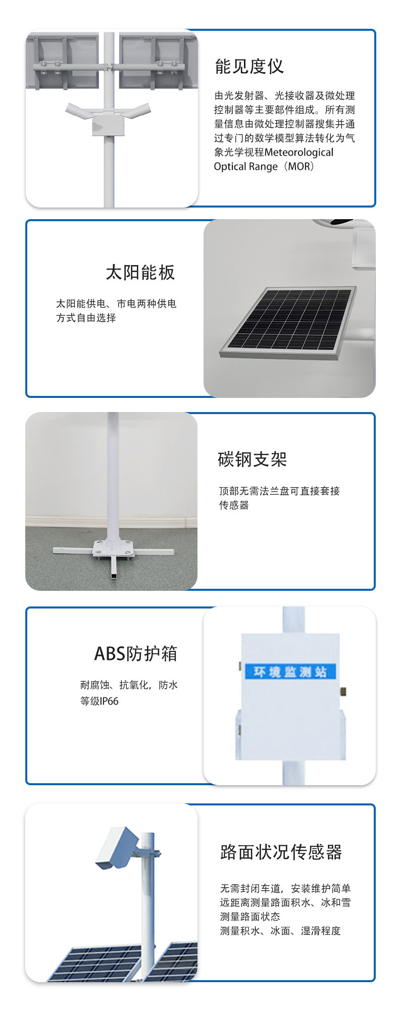 公路气象站系统组成:能见度传感器、遥感式路面状况传感器、气象传感器、采集器、立杆支架、供电系统、云平台
