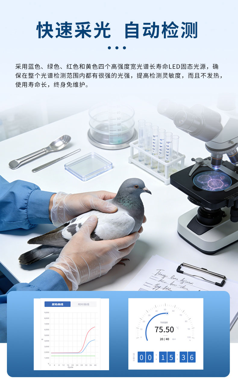 B免维护的灵敏光学系统:配备4个独立LED光源与4个独立光电二极管检测器,实现四通道荧光同步精准检测。采用超长寿命进口光源,设计寿命期内免维护,无需额外校准或更换,保障检测结果长期一致性与高灵敏度。