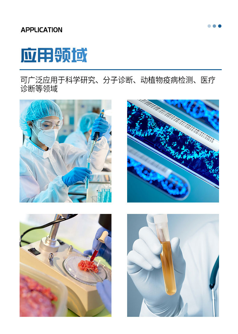 核酸提取仪通过磁珠法提取核酸,选择相应的试剂盒就可以自动的从多种样品材料如血液、组织、细胞中分离纯化高纯度的核酸。具有兼容性强(适配预封装提取试剂盒,也可适配单头份试剂)、提取速度快、提取回收率高、操作简便的优点,是分子生物学实验室检测试验的得力“助手”。可广泛应用于科学研究、分子诊断、动植物疫病检测等领域。