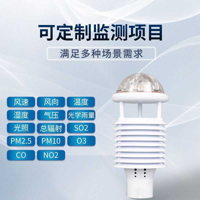 该设备创新性的采用十二要素一体式传感器,可对风速、风向、温度、湿度、气压、光学雨量、pm2.5、pm10、CO、NO2、SO2、O3等气象要素进行实时观测,可实现户外气象参数24小时连续在线监测,