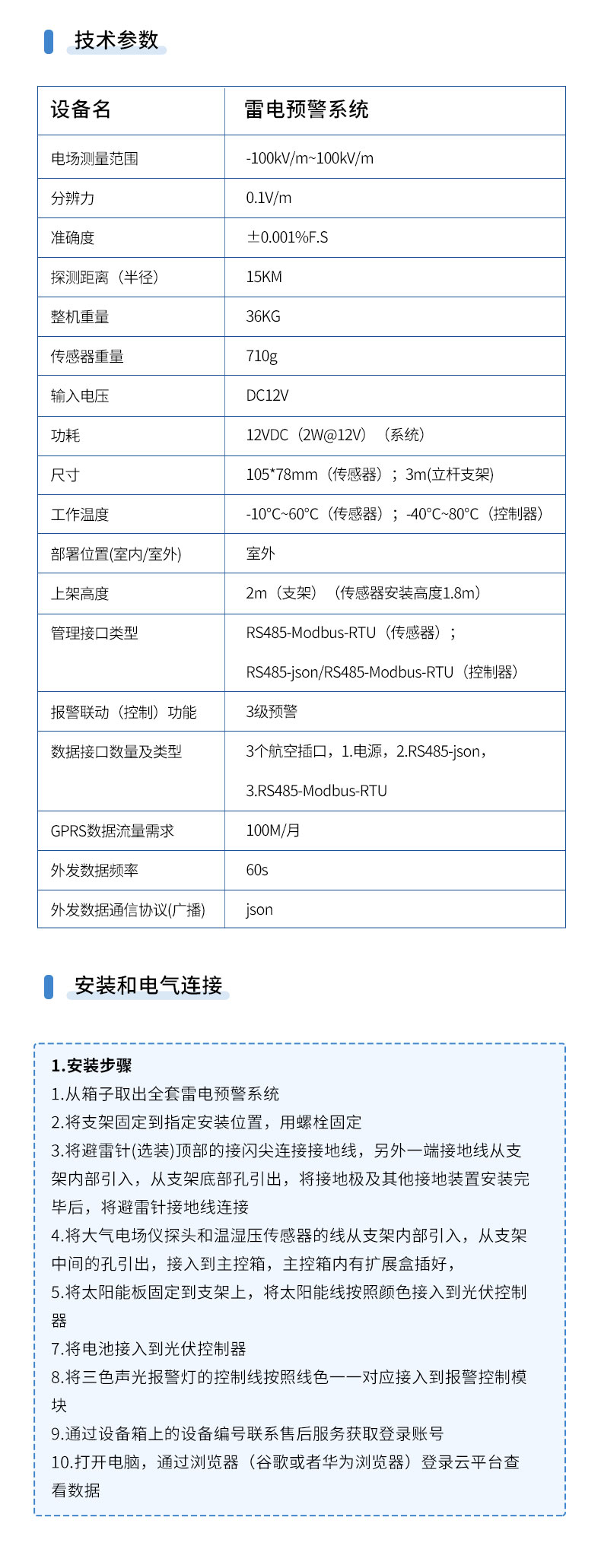 【产品简介】一、雷电预警系统产品简介雷电预警系统是全数字化电场探测与雷电预警平台,其核心电场探测结构基于电荷感应原理、采用MEMS(微机电系统)技术研制,无电机等易磨损可动机械部件,具有体积小···
