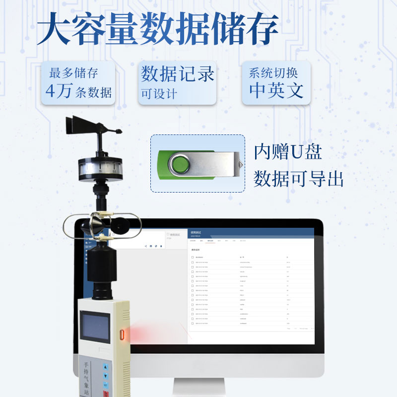 手持式风速风向仪是一款携带方便,操作简单,集多项气象要素于一体的可移动式气象观测仪器。系统采用精密传感器及智能芯片,能同时对风向、风速两项气象要素进行准确测量。内置大容量FLASH存储芯片可存储至少一年的气象数据;通用USB通讯接口,接入U盘导出数据,方便用户对气象数据的进一步处理分析。