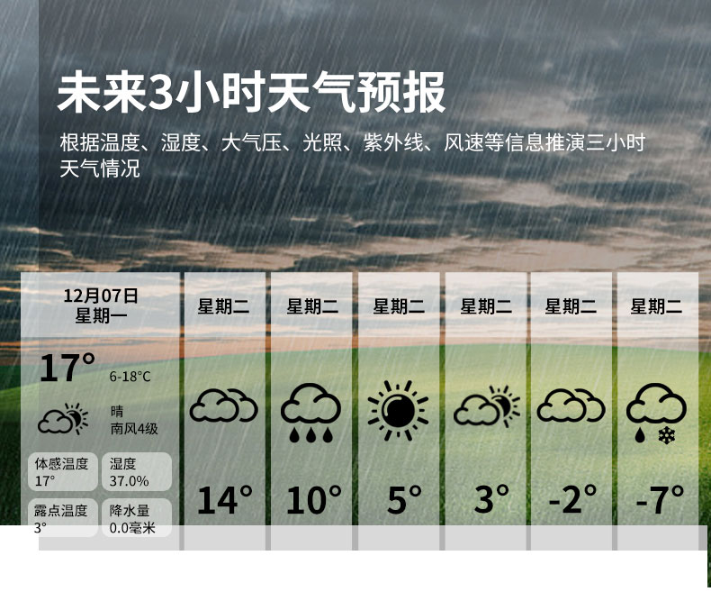 | 未来3小时天气预报 | 根据温度、湿度、大气压、光照、紫外线、风速等信息推演三小时天气情况 | ||||