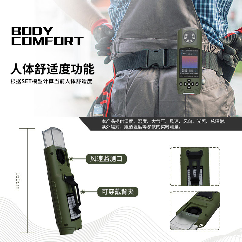 【产品简介】一、可穿戴手持气象仪产品简介本产品提供温度、湿度、大气压、风速、风向、光照、总辐射、紫外辐射、跑道温度等参数的实时测量。并具备户外的SOS求救、电子罗盘、跑道温度、未来3小时天气预···