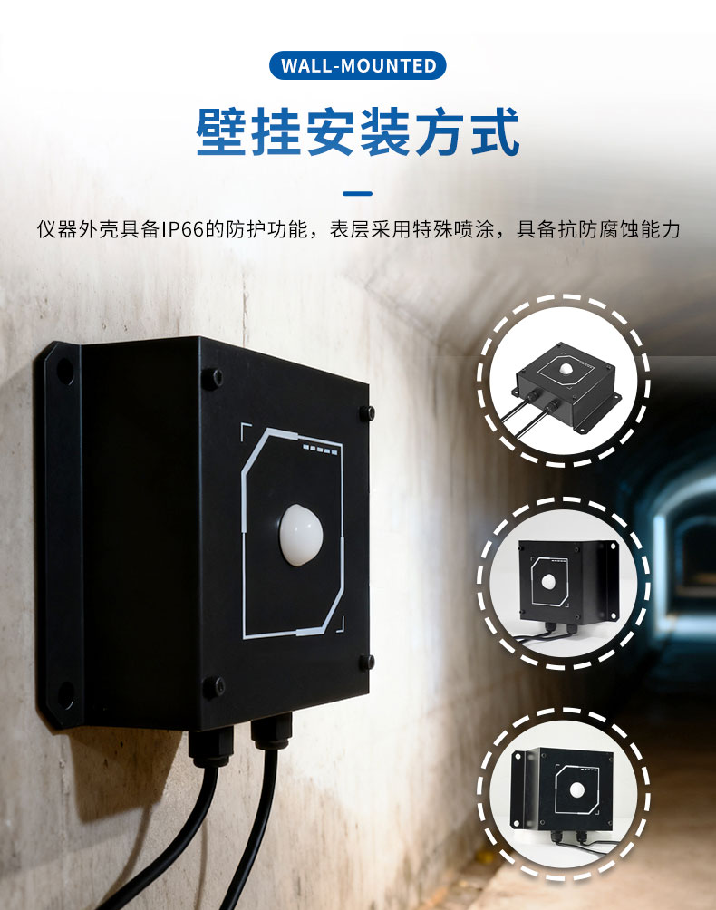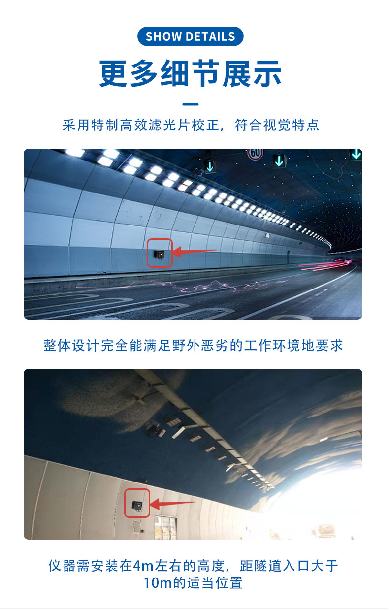 隧道洞内照度检测器安装在隧道内指定区域的墙壁上,为了避免因事故或汽车残骸对其的损伤,需安装在4m左右的高度,距隧道入口大于10m的适当位置。具有高可靠性和低维护量.最新微处理器技术,完全数字化运行,安装调试简易。