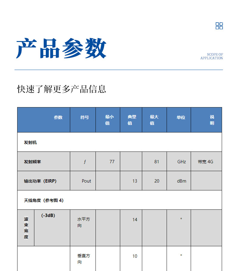 | 发射频率 | ƒ | 77 | 81 | GHz | 带宽4G | ||
