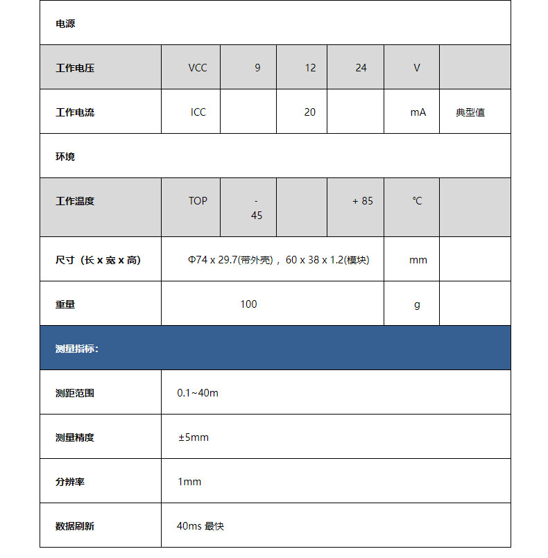 | 尺寸(长x宽x高) | Φ74x29.7(带外壳),60x38x1.2(模块) | mm | |||||