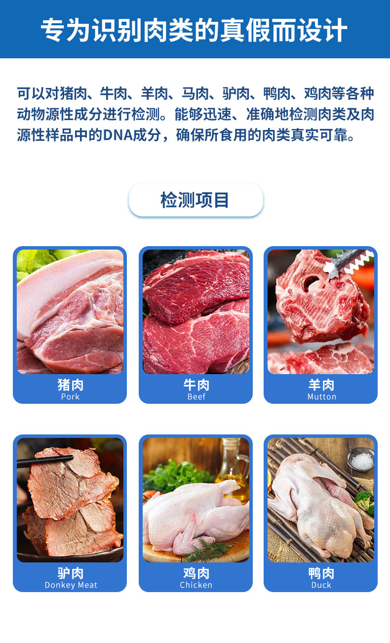 【产品简介】一、真假肉检测仪简要介绍:真假肉检测仪是一款高效、便捷的食品检测设备,专为识别肉类的真假而设计。可以对猪肉、牛肉、羊肉、马肉、驴肉、鸭肉、鸡肉等各种动物源性成分进行检测。能够迅速、···