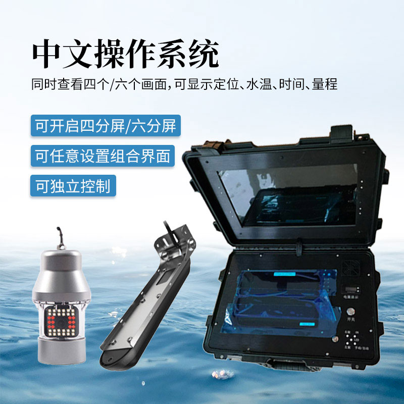 2、屏幕功能:中文操作系统,可开启四分屏/六分屏,同时查看四个/六个画面,且可独立控制,也可任意设置组合界面,可显示定位、水温、时间、量程。