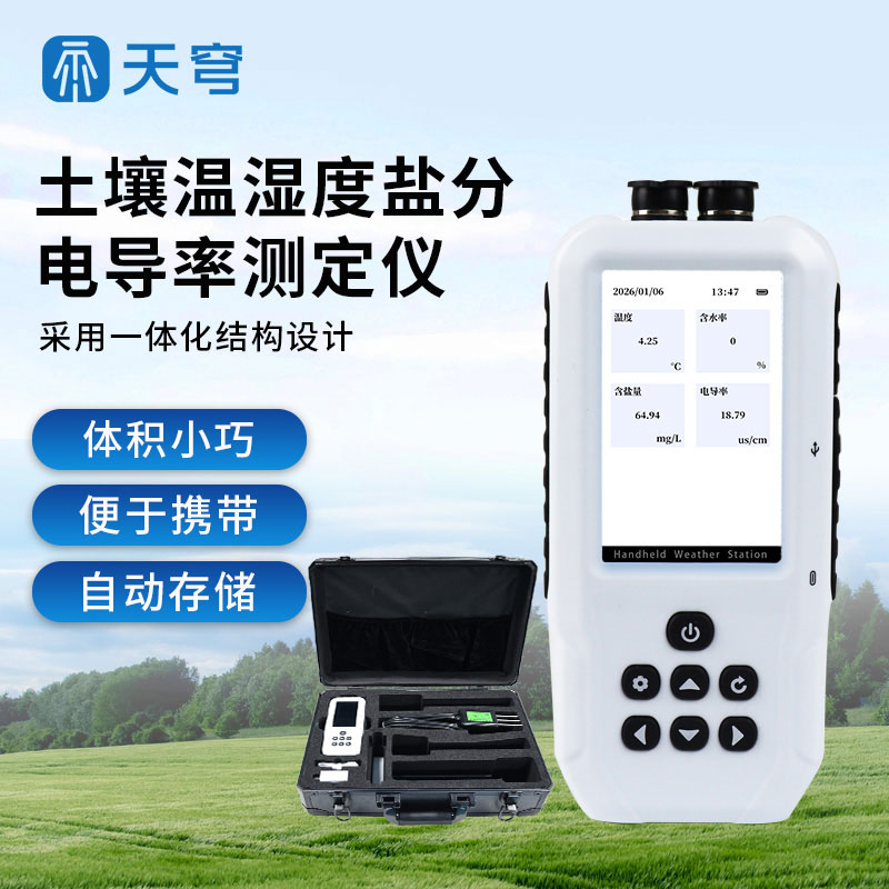 【产品简介】一、土壤温湿度电导率含盐量测定仪产品简介土壤温湿度电导率含盐量测定仪是一款高度集成的多功能环境监测设备,采用一体化结构设计,能够快速、准确地测量土壤中的含水量、温度、电导率、含盐量···