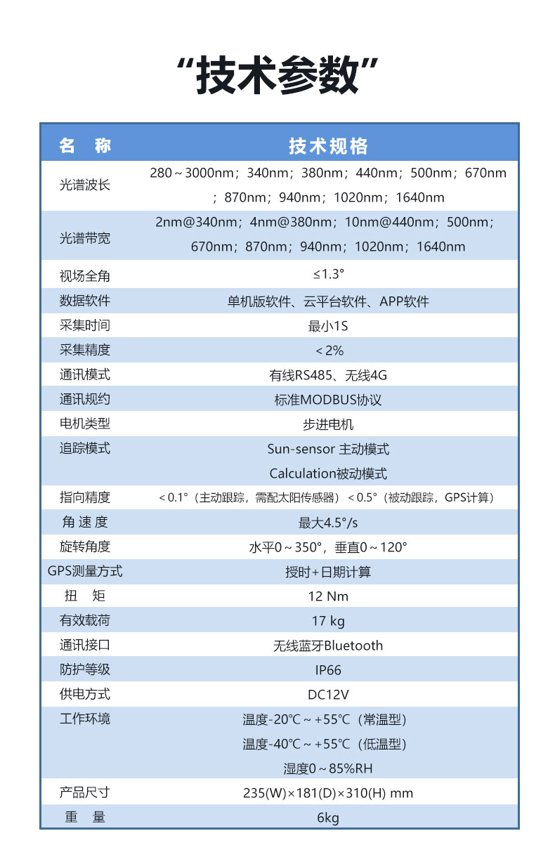| 数据输出 | 280辐射瞬时值,340辐射瞬时值,380辐射瞬时值,440辐射瞬时值,500辐射瞬时值,670辐射瞬时值,870辐射瞬时值,940辐射瞬时值,1020辐射瞬时值,1640辐射瞬时值,280辐射累计值,340辐射累计值,380辐射累计值,440辐射累计值,500辐射累计值,670辐射累计值,870辐射累计值,940辐射累计值,1020辐射累计值,1640辐射累计值,太阳高度角,太阳方位角 |