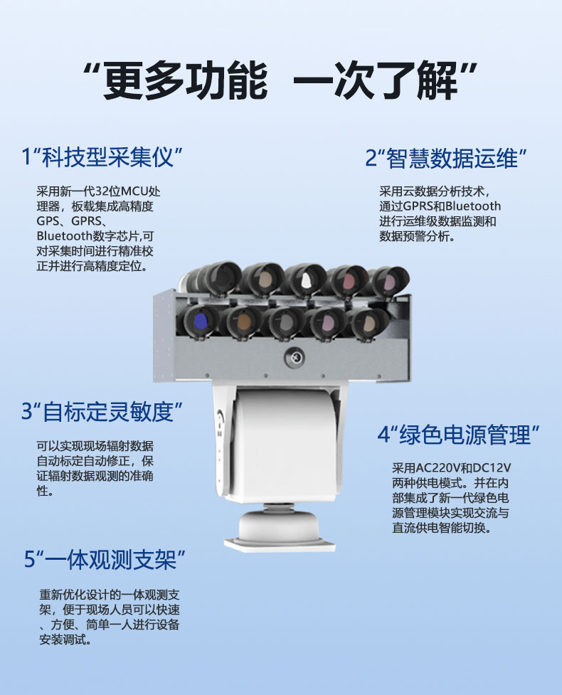 1、辐射数据监测:可以对10种波段的直接辐射数据进行观测,同时还可以监测太阳总辐射、散射辐射、反射辐射、紫外辐射、光合辐射、净全辐射等多种用途辐射数据。