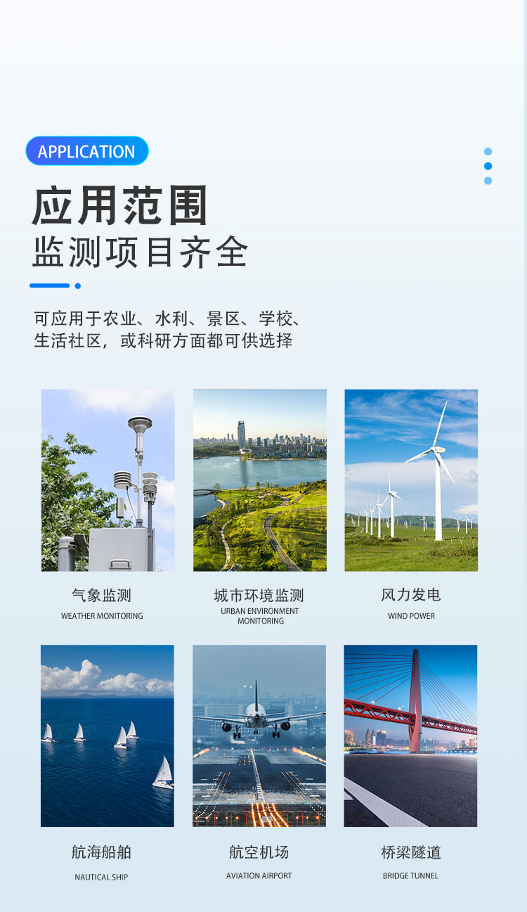 可广泛应用于城市环境监测、风力发电、气象监测、桥梁隧道、航海船舶、航空机场等领域,无需现场维护何校准。