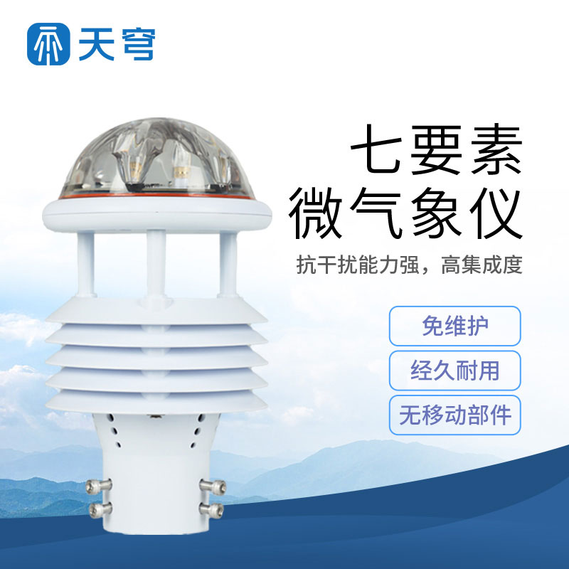 七要素微气象仪将气象标准七参数(空气温度、空气湿度、风速、风向、大气压力、光学雨量、光照)过一个高集成度结构来实现,可实现户外气象参数24小时连续在线监测,通过数字通讯接口将七项参数一次性输出给用户。