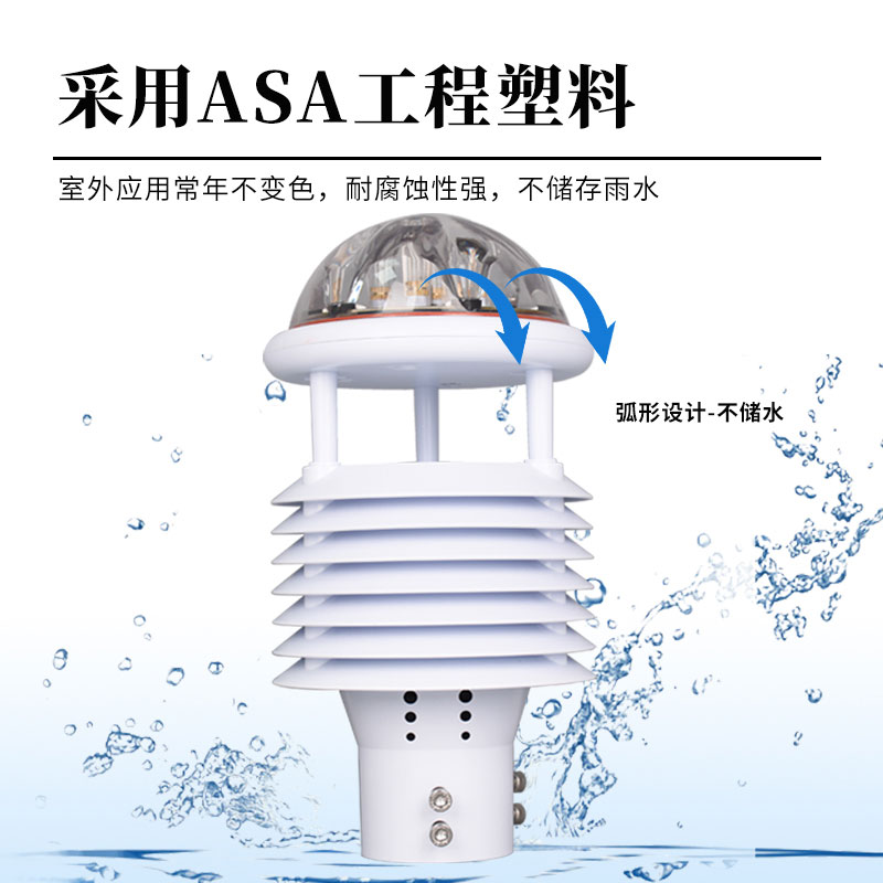 多功能气象传感器创新性地将空气温度、空气湿度、风速、风向、大气压力、光学雨量、总辐射、PM2.5、PM10监测通过一个高集成度结构来实现,可实现户外气象参数24小时连续在线监测,通过数字通讯接口将九项参数一次性输出给用户。产品结构紧凑,外形美观、大方、高度集成产品。