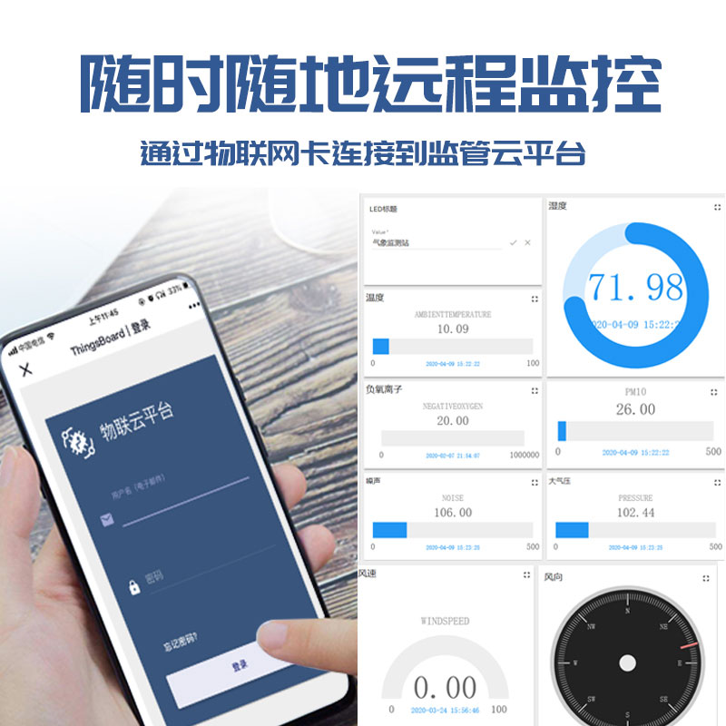 3、该设备具有 1 路百叶盒(温度、湿度、噪声、PM2.5、PM10、气压)采集、1 路风速采集、1 路风向采集。