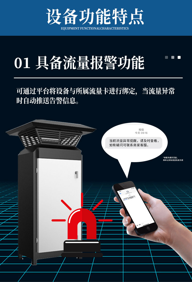 17、具备流量报警功能。可通过平台将设备与所属流量卡进行绑定,当流量异常时自动推送告警信息。