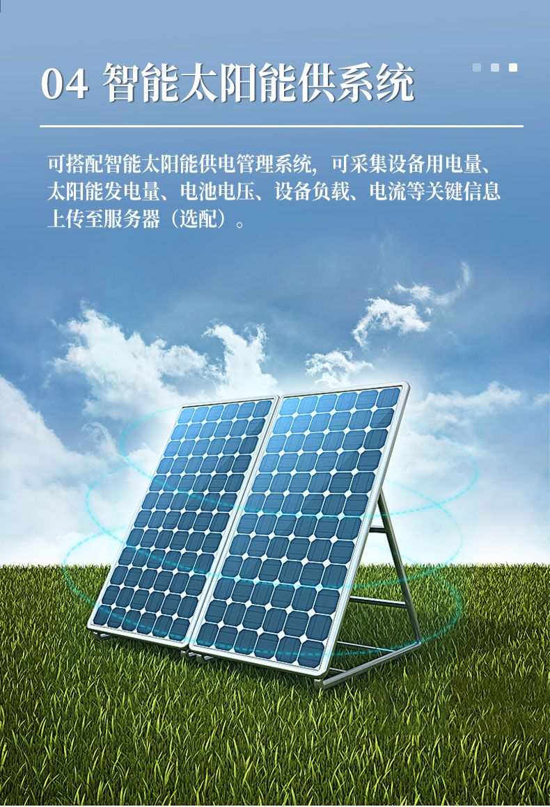 16、可搭配智能太阳能供电管理系统,可采集设备用电量、太阳能发电量、电池电压、设备负载、电流等关键信息上传至服务器(选配)。